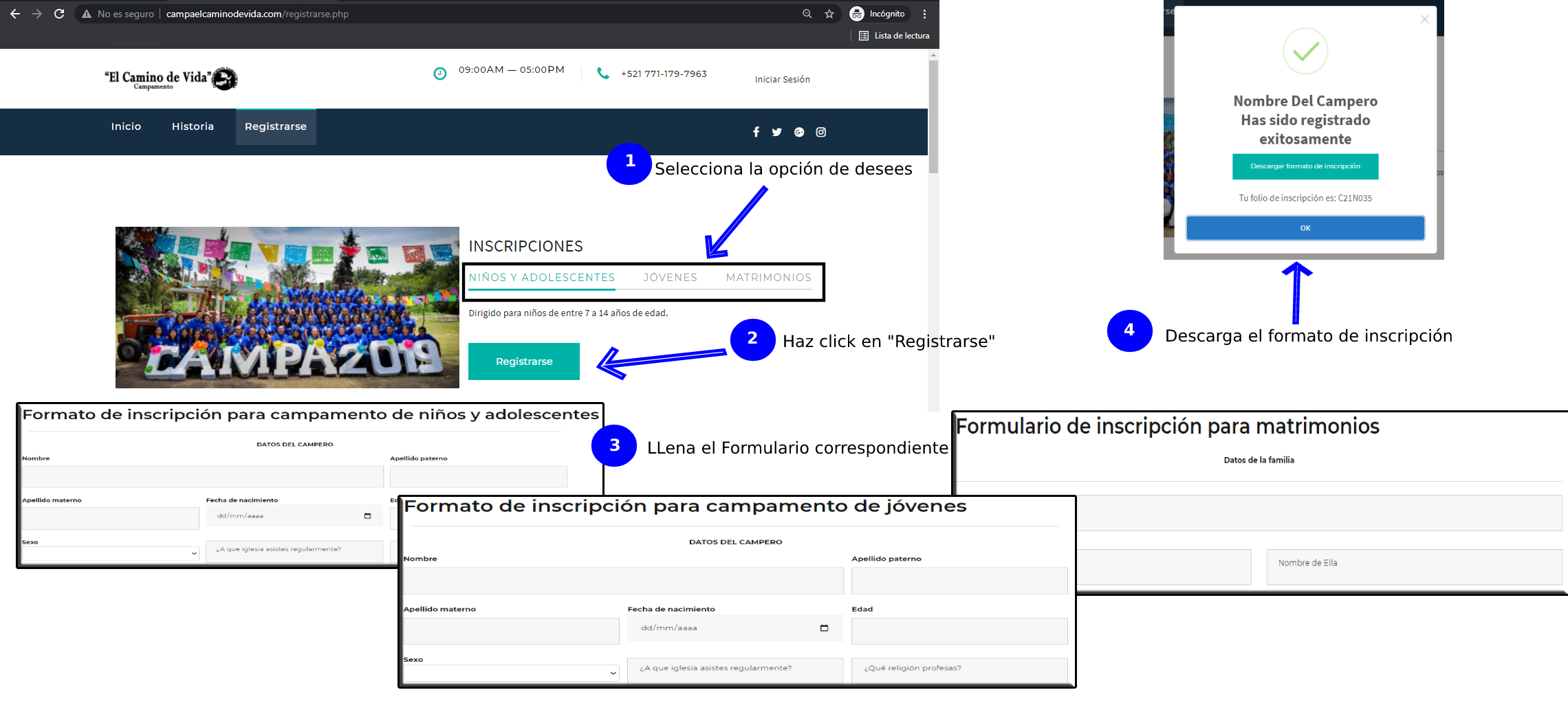 - • Campamento de matrimonios: Costo: $1700 por matrimonio + 1 hijo menor de 11 años gratis, hijo extra/sobrino/nieto/conocido: $300. Padre/madre soltero (a): $850 + 1 hijo gratis menor de 11 años, hijo extra: $300. (En el caso de padre/madre soltero/a, la cabaña será compartida con otra familia en la misma situación).